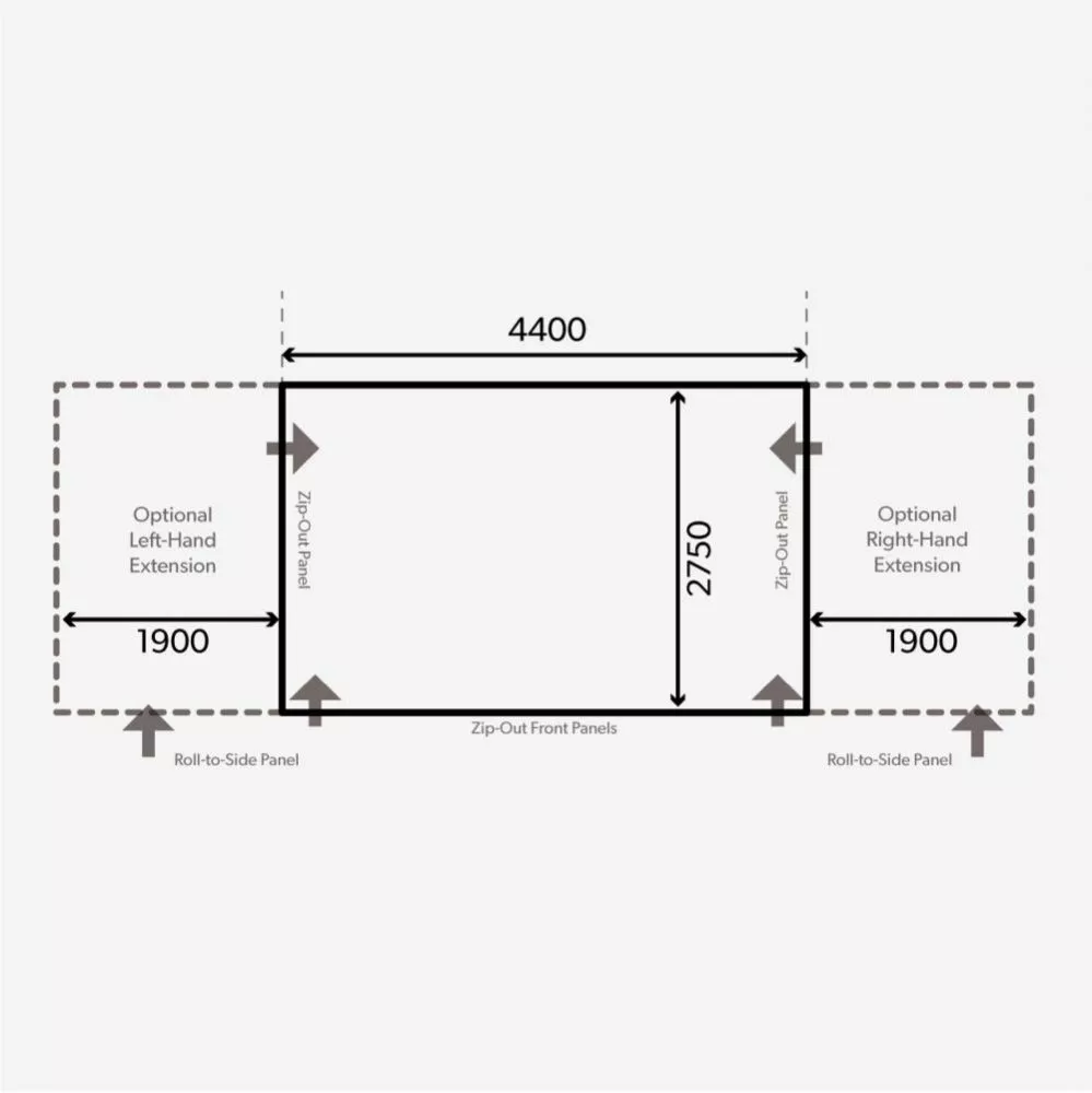 optional erhältliches Front-Vordach, Side Wing und Vorzelterweiterungen