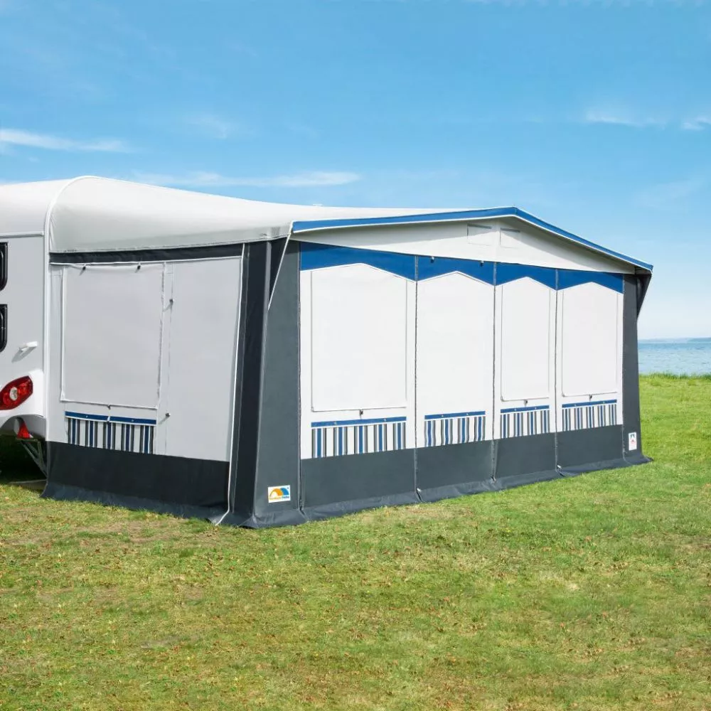 Das Wohnwagenvorzelt Frankana Freiko Rhön DC ist ein Dauervorzelt, bestehend aus robustem PVC-Gewebe. Es ist ideal für Saison- und Dauercamping geeignet. Die Vorderwand besteht insgesamt aus 4 Teilen, jedes Element kann bei Wunsch einzeln herausgenommen oder für den beliebten Verandaeffekt abgeklappt werden. Die hochrollbare Türe kann rechts, links oder mittig in der Vorderwand eingesetzt werden.