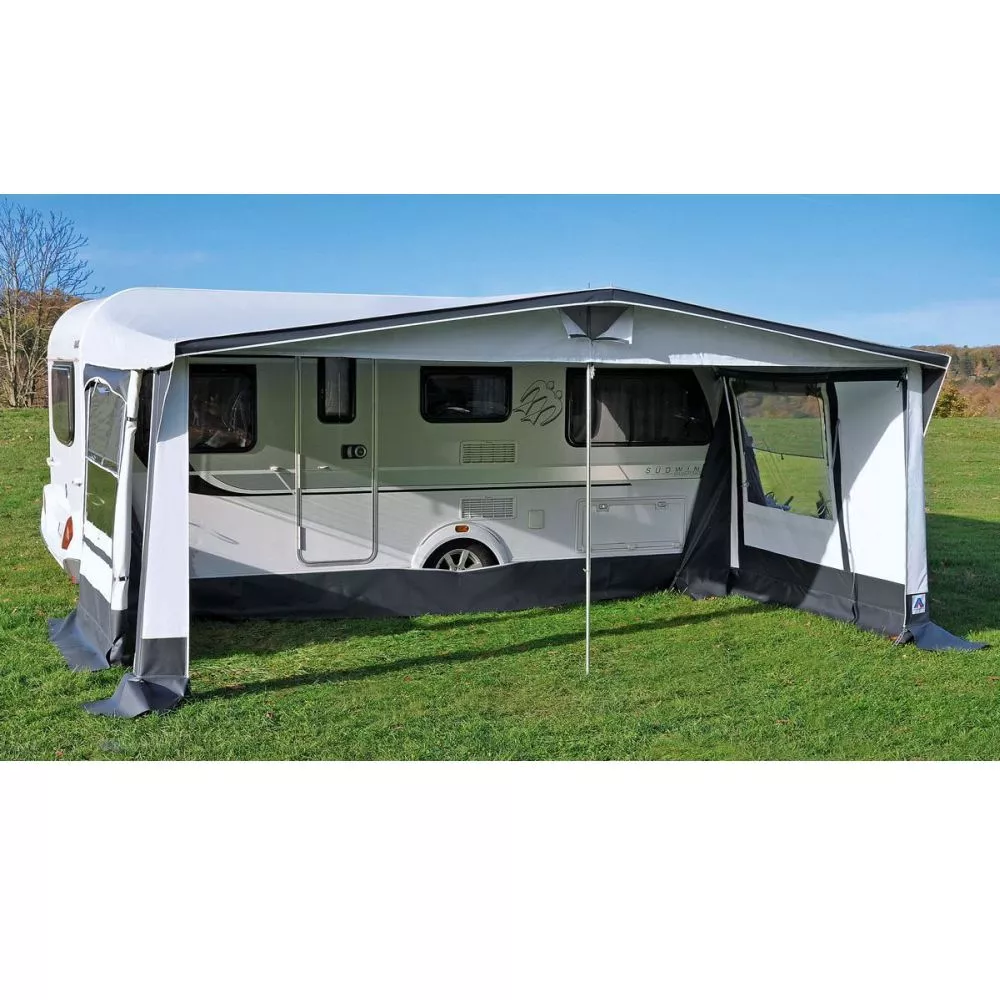 Das Wohnwagenvorzelt Hahn Zelte Finnland ist ein grosses Dauerstandvorzelt, bestehend aus robustem PVC-Gewebe. Es ist ideal fürs Ganzjahrescamping geeignet. Mit Tiefe von 280 cm hast du genügend Platz um mit deiner ganzen Familie einen entspannten Urlaub zu geniessen.Das leichte und dennoch starke Ø 25 mm Stahlgestänge (im Lieferumfang enthalten) lässt sich im Nu einziehen, so dass der Urlaub alsbald starten kann. Bei Wunsch kann es optional auch durch ein noch stärkeres Ø 32 mm Stahlgestänge ausgetauscht werden.