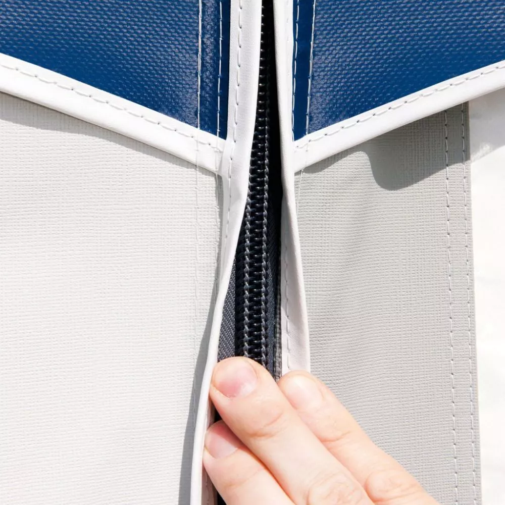 In den Seitenwänden sind grosse Fenster mit Gazeeinsatz eingearbeitet. Sie können mit praktischen Prägefolienfestner für mehr Privatsphäre geschlossen werden. Die rechte Seite hat eine seitlich wegrollbare Eingangstüre, für einfacheren Zugang zum Vorzeltinneren. Für mehr Platz oder als Schlafplatz für Gäste kann ein optionaler Seitenanbau rechts am Vorzelt angebracht werden. Die Seitenwand dient hier als Trennwand und kann somit einfach bestehen bleiben.