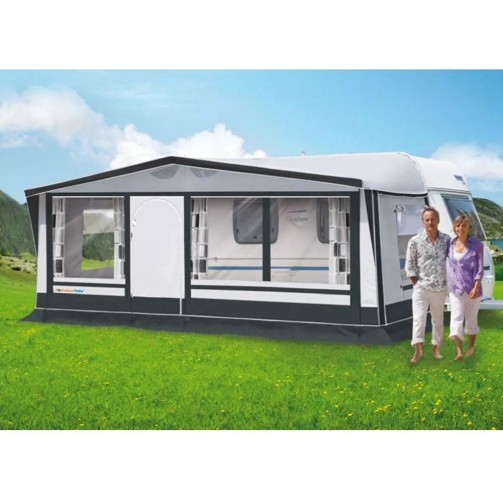 Das Frankana Freiko Barcelona kann sowohl als geschlossenes Vorzelt, als auch als offenes Sonnendach genutzt werden. Die Vorder- und Seitenwände sind komplett herausnehmbar. Die Vorderwand kann geteilt und als Veranda abgeklappt werden. Auch eine seitlich wegrollbare Eingangstür ist enthalten. Für noch mehr Gemütlichkeit und wohnliche Atmosphäre sind passende Gardinen im Lieferumfang mit dabei.