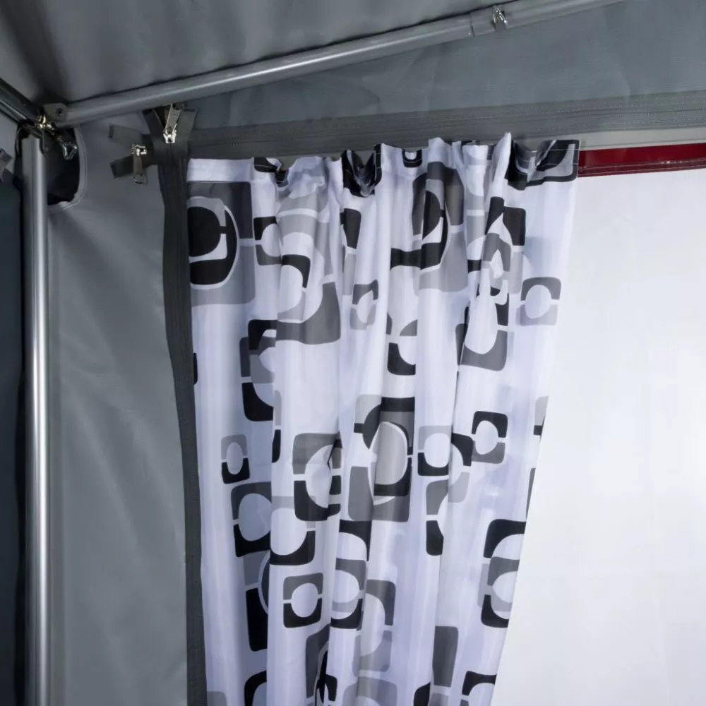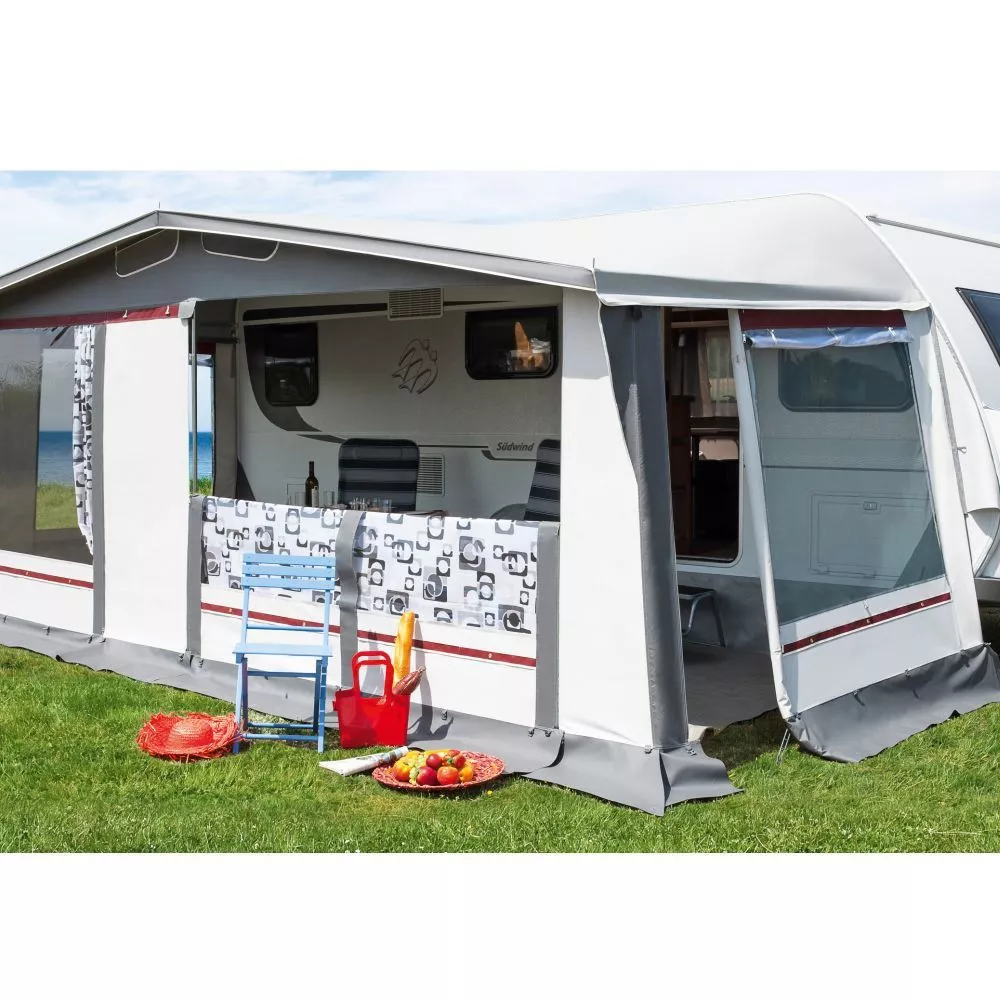 Das Frankana Freiko Lux kann sowohl als geschlossenes Vorzelt, als auch als offenes Sonnendach genutzt werden. Die Vorder- und Seitenwände sind komplett herausnehmbar. Die Vorderwand kann geteilt und als Veranda abgeklappt werden. Auch eine hochrollbare Eingangstür ist enthalten. Für noch mehr Gemütlichkeit und wohnliche Atmosphäre sind passende Gardinen im Lieferumfang mit dabei.